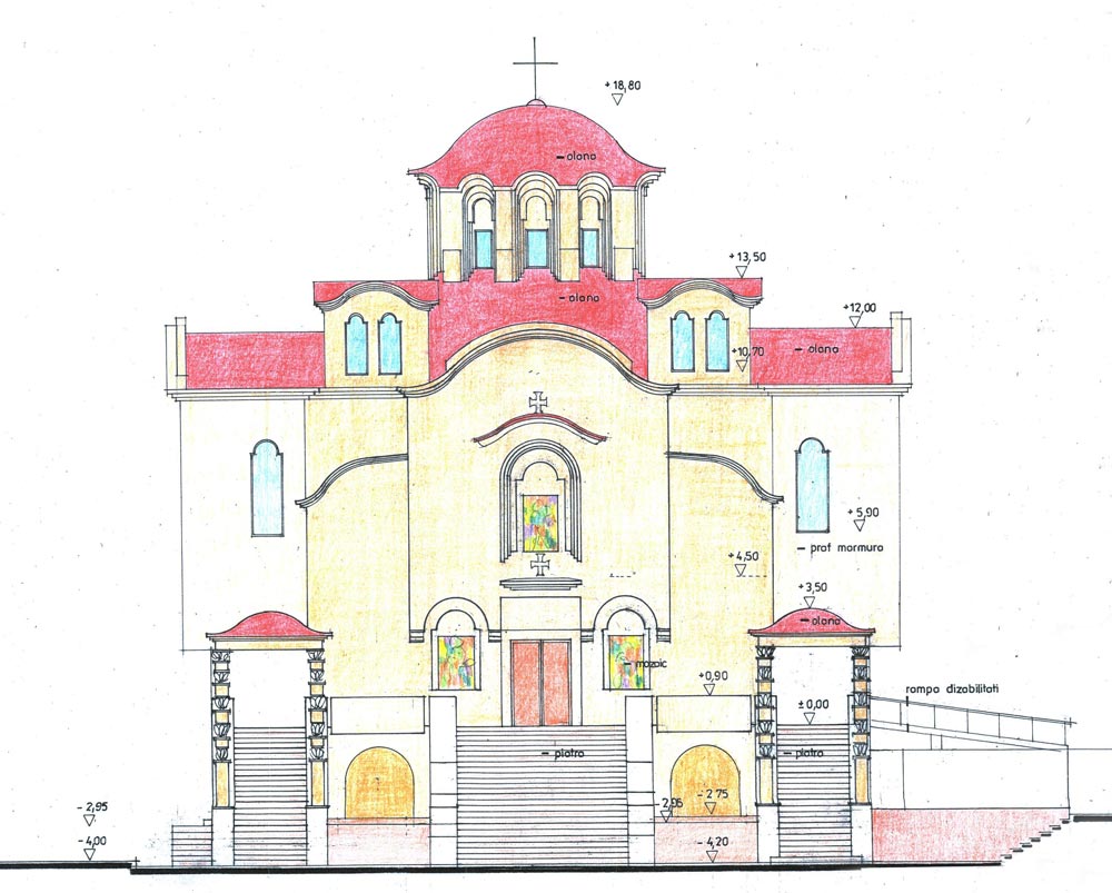 Absida centrală, care cuprinde altarul înălţat cu 50 cm faţă de nivelul general al parterului, va fi încadrat de diaconicon şi proscomidiar şi de două spaţii laterale la dreapta şi la stânga acestora, concepute ca mici paraclise ce vor adăposti Sfinte Moaşte.